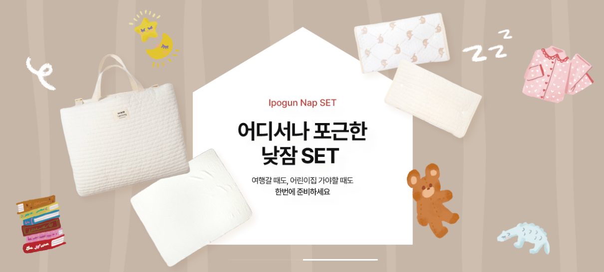 낮잠이불, 베개, 방수요, 쿨매트, 블랭킷, 유모차라이너, 애착인형, 아기패드, 바디필로우 등